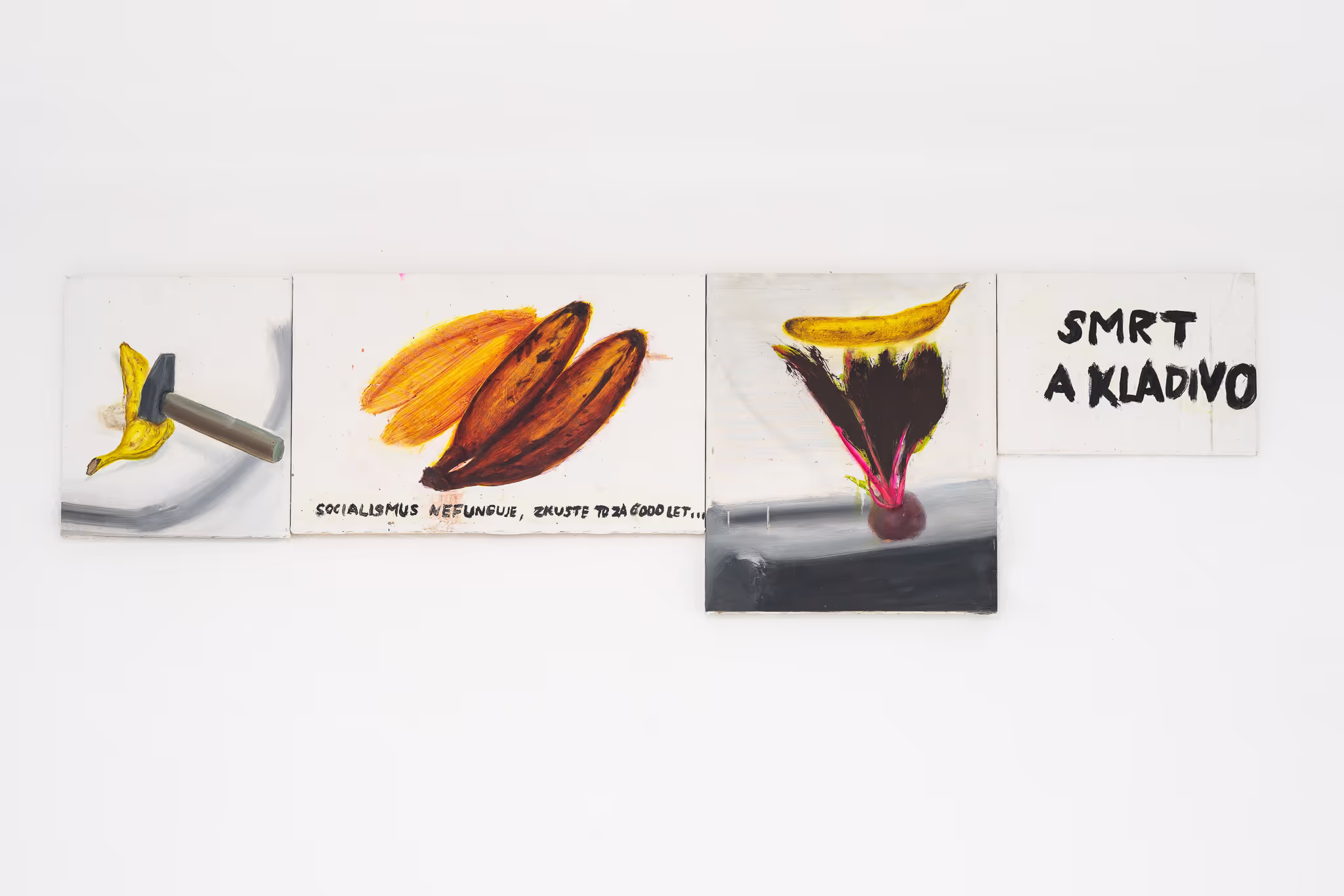 Oproti předcházejícím Petrbokovým výstavám se hledání nové formy i obsahu stalo hlavním záměrem, procesem. Výstava představuje cestu a proces práce. Od obrazu s trsem banánů, na který Petrbok náhodně narazil v obchodě s ovocem a zeleninou, až po zlaté bytosti v „krajině“ z masa. Banány se staly prvním impulsem, který přerostl v celé téma a barevnou paletu. Zlatá barva, která ho díky tomu začala fascinovat, formovala nový celek, z něhož vycházejí nové principy, mytologické charaktery a hloubka jeho maleb.